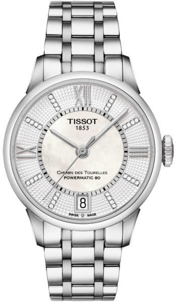 Tissot Chemin Des Tourelles Powermatic 80 női karóra T099.207. 11.118. 00 egy kerek formájú, ezüst színű nemesacél óratokkal, gyöngyház analóg számlappal és ezüst nemesacél szíjjal rendelkező elegáns Tissot karóra. Az óra mechanikus (automata) szerkezettel és 5 ATM vízállósággal rendelkezik, tehát mérsékelten vízálló. Ez a fantasztikus óra most 319920 áron megrend