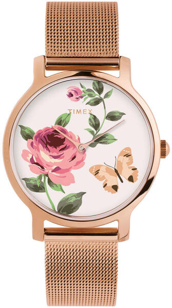 A bájos Timex női karóra felkelti minden olyan hölgy figyelmét rózsaszín arany kivitelezésével és színes számlapjával, amelyet pillangók és virágok díszítenek.
