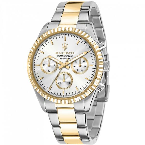 Maserati Competizione férfi karóra R8853100021 egy kerek formájú, ezüst színű nemesacél óratokkal, ezüst analóg számlappal és bicolor nemesacél szíjjal rendelkező divatos Maserati karóra. Az óra elemmel működő kvarc szerkezettel és 10 ATM vízállósággal rendelkezik, tehát fürdésre, úszásra használható. Ez a fantasztikus óra most 107900 áron megrendelhető webshopu