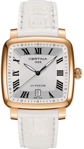 Certina DS PODIUM férfi karóra C025.510. 36.033. 00 egy szögletes formájú, rosegold színű nemesacél óratokkal, ezüst analóg számlappal és fehér valódi bőr szíjjal rendelkező divatos Certina karóra. Az óra elemmel működő kvarc szerkezettel és 10 ATM vízállósággal rendelkezik, tehát fürdésre, úszásra használható. Ez a fantasztikus óra most 157950 áron megrendelhe