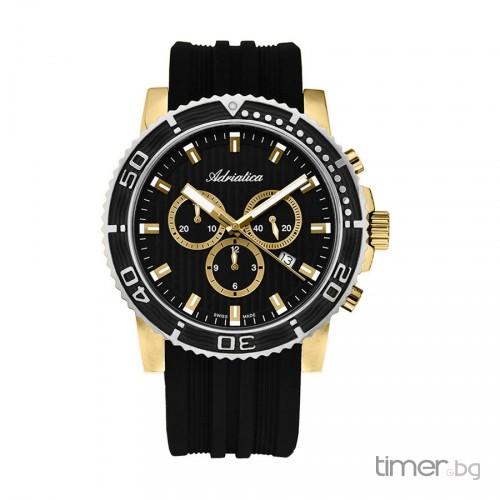 Adriatica leírása: Férfi Kvarc, Ronda 5030 szerkezet Rozsdamentes acél tok Kronográf Fekete színű számlap Keményített üveg Dátumkijelzés Kaucsuk szíj 100 méterig vízálló 1 év garanciaAz Adriatica márkát a Swiss Watch Company alapította 1931-ben. A márka célja az volt, hogy kiváló minőségű órákat készítsen, melyek megfelelnek a változó igényeknek mind kinézet, m