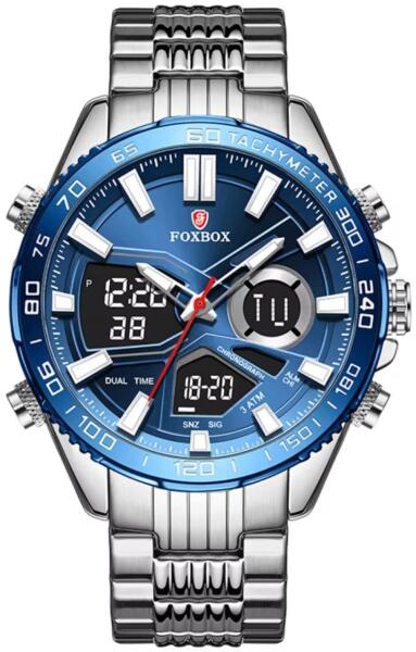 FOXBOX Luxury karóra Ez a modern FOXBOX Luxury márkájú karóra a magas szintű funkcionalitást ötvözik az exkluzív dizájnnal a modern férfiak számára. A karóra tokja tartós acélból készült, amely garantálja a hosszú élettartamot és a magas szintű ellenállást a mindennapi viselés közben is. További funkciók közé tartozik a duális időmutatás, kronográf és naptár.