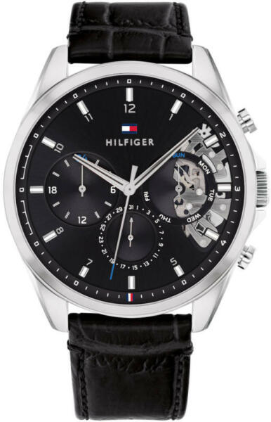 Manufacturer no. : 1710449 Manufacturer series: men's watch Baker 44mm Functions: 24-hours, Date, Day, Hour, Minute, Second Movement: Battery (quartz) Dial color: Black Display: Analog Water resistant: 5 Bezel: Fixed Surface finish: Matted, Polished Case color: Silver Case material: Stainless steel Case thickness: 11 Case shape: Round Case width: 44 Caseback: pressed, Stainless steel bottom Gender