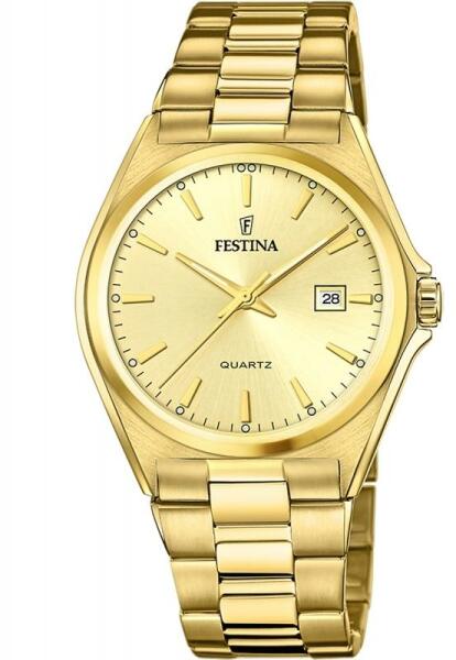 Ez az egyedi óra első látásra elvarázsolja Önt aranyszínű kialakításával. A Festina 20555/3 férfi karóra tökéletesen meg fog jelenni a csuklóján. A nemes acél, amelyből az óra készült, megvédi az órát a sérülésektől. A kijelzőt a számjegyeket felváltó indexek jellemzik. A számlapon a harmadik óra pozíciójában dátumkijelzés található. A mutatók lumineszcen