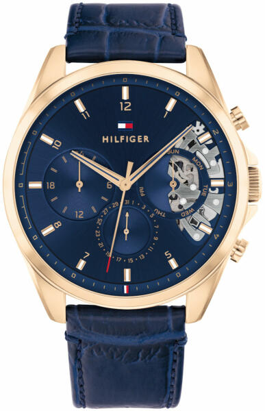 Vízállóság szűrő: mérsékelten vízálló | Szerkezet típusa: Elemmel működő quartz | Óratok anyaga: Nemesacél | Szíj: Valódi bőr | Üveg: Ásványi üveg | Vízállóság: 50 m | Óratok színe: Rosé | Számlap színe: Kék | Szíj szín: Kék | Óratok szélesség: 44 mm | Funkciók: Dátum, Nap neve kijelzés, Második időzóna kijelzés (TH1710451)