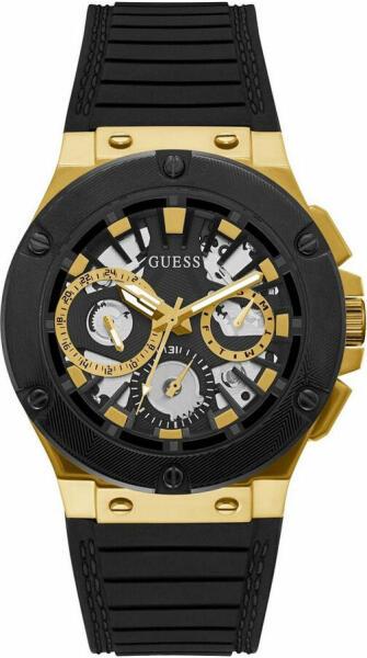 Praktikus kiegészítő a modern férfiak számára. Bemutatjuk a Guess GW0487G5 férfi karórát műanyag (gumiszíjjal). Első pillantásra az arany és a fekete szín gyönyörű kombinációja vonzza Önt. A masszív tok az ásványi üveggel együtt megvédi az órát a sérülésektől. Az egyedi kijelzőn három kronográf található, amelyek a dátumot, a hét napját és a 12/24 órás s