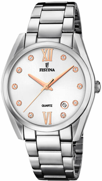 A Festina 16790/A női karórát olyan nők számára tervezték, akik stílusra és szépségre vágynak. Az analóg óra klasszikus megjelenését kvarcmű hajtja, a számlapot megbízható ásványi kristály védi. Az óra ezüstös megjelenését tökéletesen kiegészíti a számlap rózsaarany színe. Az óra átmérője 37 mm. Az ezüstszínű design még mindig időtálló, ezért nem sza