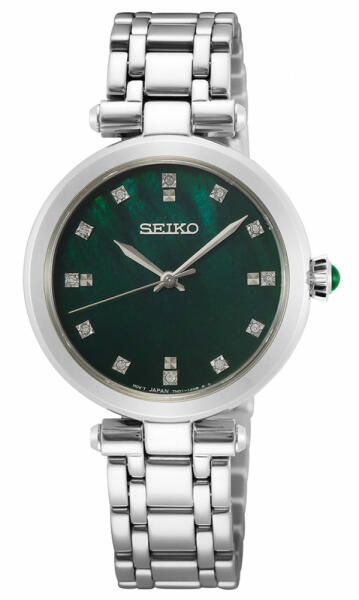 Márka: SEIKO | Kollekció: Quartz | Modell: SRZ535P1 | Garancia: 2 évek | Szín: ezüst | Szín: zöld | Tok színe: ezüst árnyalat | Tok anyaga: nemesacél | Táplálás: elem | Szíj anyaga: nemesacél | Funkciók: Gyémántokkal | Vízálloság: 50M/5ATM | Üveg: zafír | Forma: kerek | Csatolás típusa: zsanérzár | Számjegyek a számlapon: gyémánt | Rendeltetés: női | Termék típu