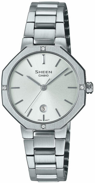Casio SHE-4543D-7AUER Női Karóra - SheenA Casio SHE-4543D-7AUER női karóra elegáns és kifinomult megjelenésével tökéletes kiegészítője lehet minden stílusnak. Az óra minimalista, mégis modern dizájnja az octagonális lünettával és a 3, 6, 9, és 12 órás pozícióban elhelyezett kristályokkal igazán különlegessé teszi. A rozsdamentes acélszíj és a karcálló zafírkris