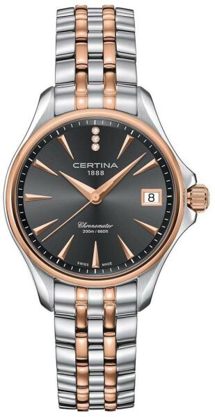 Certina DS ACTION Lady Diamonds női karóra C032.051. 22.086. 00 egy kerek formájú, bicolor színű nemesacél óratokkal, szürke analóg számlappal és bicolor nemesacél szíjjal rendelkező elegáns Certina karóra. Az óra elemmel működő kvarc szerkezettel és 20 ATM vízállósággal rendelkezik, tehát búvárkodásra megfelelő. Ez a fantasztikus óra most 265900 áron megrendelhet