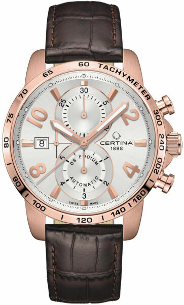 Márka: CERTINA | Kollekció: DS PODIUM | Modell: 0344273603700 | Garancia: 2 évek | Szín: barna | Tok színe: rózsaarany | Tok anyaga: nemesacél | Táplálás: automata | Szíj anyaga: bőr | Funkciók: Dátum – a hónap napja | Funkciók: Stopper | Funkciók: Super-LumiNova | Vízálloság: 100M/10ATM | Üveg: zafír | Forma: kerek | Számjegyek a számlapon: arab | Számjegyek a számlapo