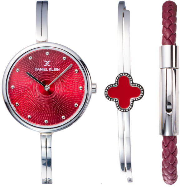 Daniel Klein női karóra ajándék karkötőkkelAz egyik karkötő ezüstszínű, a másik karkötő bordó és ezüstszínű A Daniel Klein óramárkát 1998-ban alapították, de egyre növekvő népszerűségnek örvend köszönhetően a kedvező árfekvésének és divatos megjelenésének. Ez nem véletlen, hiszen a cég mottója "Fashion for everyone", vagyis "Divat mindenki számára". A D