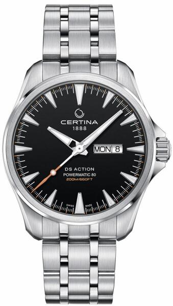 Certina DS ACTION DAY-DATE Powermatic 80 férfi karóra C032.430. 11.051. 00 egy kerek formájú, ezüst színű nemesacél óratokkal, fekete analóg számlappal és ezüst nemesacél szíjjal rendelkező divatos Certina karóra. Az óra mechanikus (automata) szerkezettel és 20 ATM vízállósággal rendelkezik, tehát búvárkodásra megfelelő. Ez a fantasztikus óra most 345900 áron megrende