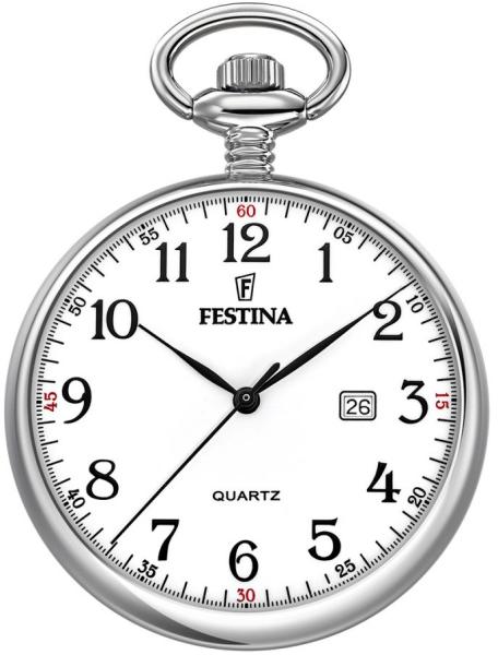 Az átlátszó számlapú zsebóra Festina ideális kiegészítője bármilyen öltözéknek. Ez a kerek, acél tokkal ellátotttársadalmi óra kvarc (elemes)óraművel működik, a 3 órás pozícióban dátumkijelzővel. A fehér számlapon az időt fekete arab számok jelzik. A számlapot sima ásványi üveg borítja. A FESTINA órák legendásak az órapiacon. Az óra összetéveszthetetlen