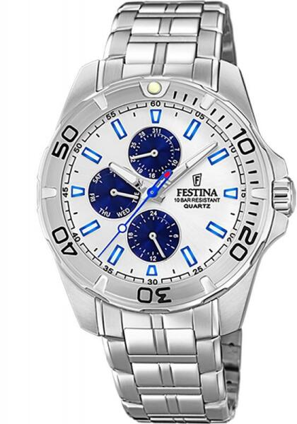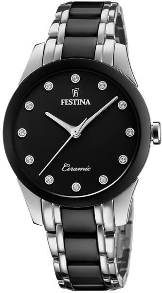 A divatos dizájnnal rendelkező női Festina órák ideális kiegészítői mind a társasági, mind az alkalmi öltözékeknek. Modern óra kerek tokkal, kvarc (elemes) óraművel. A fekete számlapon az időt a lapos ásványi kristály által fedett, csillogó kockacirkon mutatja. Az 50M vízállóságnak köszönhetően az órát még fürdés közben sem kell levennie a csuklójáról. A kiv