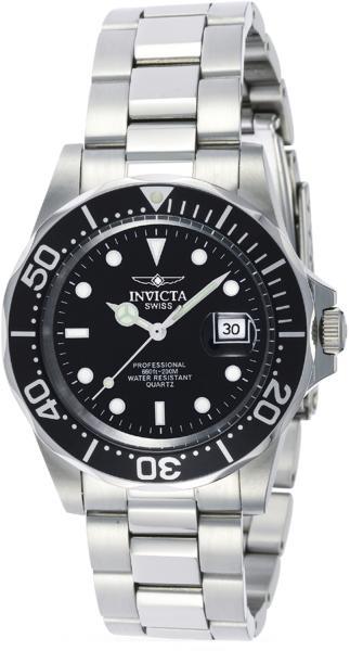 Búvár Invicta karórák a Pro Diver kollekcióból. Ideális kiegészítők férfiaknak , akik előnyben részesítik az analóg és kerek alakú karórákat. A belül ellenálló 10 mm magas tokban, melyet minőségi acél alkot , megbízható elemes - swiss made gépezetet talál, mely 40 mm átmérőjű számlapot működtet. A számlapot ellenálló ásványi üveg véd. A tok ezüst, száml