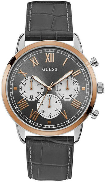 Eredeti Doboz, Pontos óraszerkezet , Kiváló minőségű anyagok, kifinomult tervezés 2év Magyar jótállás, 15 napos pénzvisszafizetés Guess Hendrix férfi óra karóra Multifunctional W1261G5 nemesacél tok, ezüst és rózsa arany bevonat, csiszolt bőr szíj, szürke, tűzött szij Quartz szerkezet, elemes naptári nap kijelző, dátumkijelzés, 24 órás kijelző 50 méter vízállós
