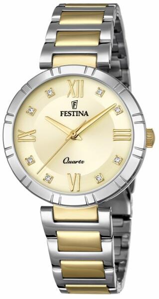 A Festina női karóra divatos kialakításával ideális kiegészítője a társasági és alkalmi öltözékeknek. Különleges acél házzal ellátott óra, kvarc (elemes) óraművel. Az időt az arany számlapon sárgaarany mutatók és római számok jelzik. A számlapot tiszta kockacirkon díszíti, és sima ásványi üveg borítja. Az 50M vízállóság biztosítja, hogy az óra vízálló