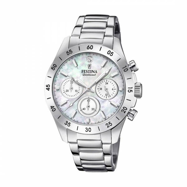 A női karóra Festina időtlen dizájnnal ideális kiegészítője mind a társasági, mind az alkalmi öltözékeknek. Óra acél tokkal, kvarc (elemes) mechanizmussal, kronográf, 24 órás számlap és egy valódi gyémánt 12 óránál. A gyöngyházszínű számlapon az időt ezüst indexek mutatják. A számlapot lapos ásványi kristály borítja, és a 100M vízállóságnak köszönhető