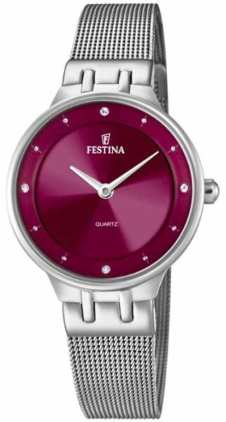 Az Festina női karóra divatos kialakítással ideális kiegészítője mind a társasági, mind az alkalmi öltözékeknek. Szociális óra acél tokkal, kvarc (elemes) óraművel. A sötétvörös számlapon az időt mutatók és világító, átlátszó cirkóniák egészítik ki. A számlapot sima ásványi üveg borítja. Az 50 M-es vízállóság biztosítja, hogy az óra vízálló legyen
