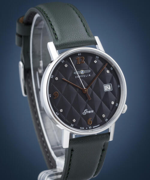 Nem: Női Stílus: Divat Szín: fekete Szíj: Bőr Tok szín: Ezüst Tok anyag: Acél Szerkezet: Quartz (elemes) Analóg/Digitális: Analóg Funkciók: Dátum Forma: Kerek Vízállóság: 50 m Súly: 35 g Magasság: 7 mm Szélesség: 36 mm movement ETA F06.111, quartz-controlled, Swiss madeanthracite dial with rose gold digits / markers with 8 crystals , produced by Swarovskistructured dial