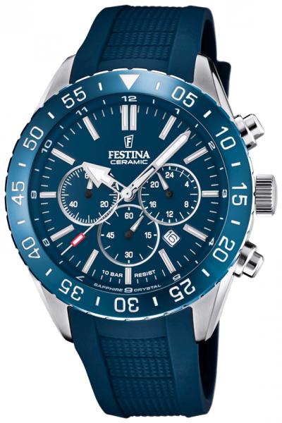 Festina A Chrono Bike egy elegáns, kiváló minőségű sportóra. A Chrono Bike órákat nem csak kerékpározáshoz tervezték, hanem bármilyen sporttevékenységhez használhatja őket. Ez a kerek, acél tokkal ellátott sportos óra kvarc (elemes) óraművel működik, kronográffal, dátumkijelzővel és 24 órás számlapon. A sötétkék számlapon az időt lumineszcens indexek és mutat