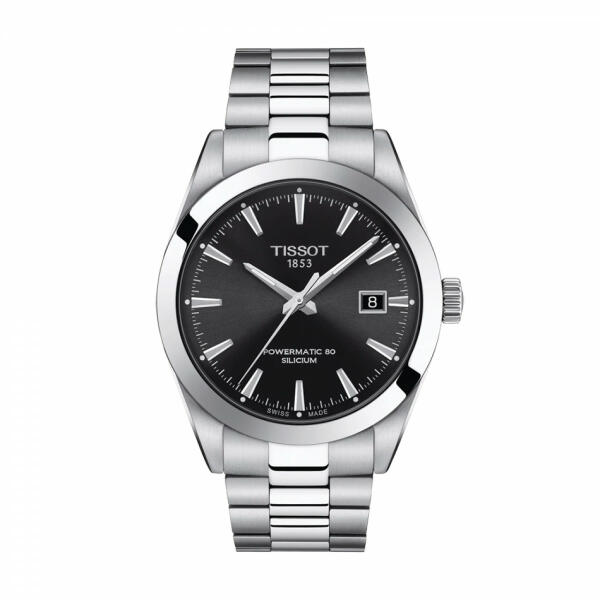 Tissot Gentleman Powermatic 80 Silicium férfi karóra T127.407. 11.051. 00 egy kerek formájú, ezüst színű nemesacél óratokkal, fekete analóg számlappal és ezüst nemesacél szíjjal rendelkező klasszikus Tissot karóra. Az óra mechanikus (automata) szerkezettel és 10 ATM vízállósággal rendelkezik, tehát fürdésre, úszásra használható. Ez a fantasztikus óra most 379900 áro