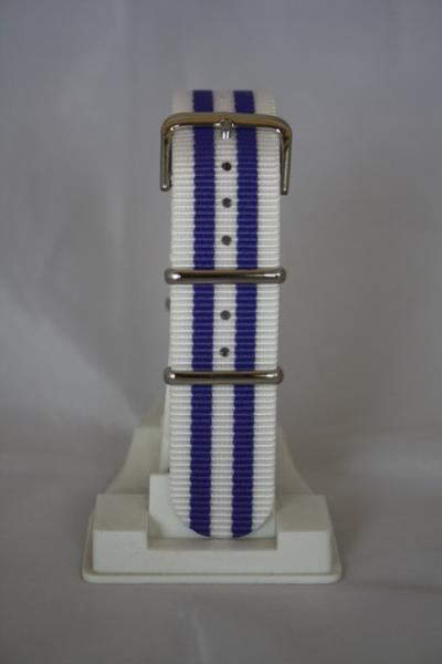 NATO óraszíj Ajánlott búvár (diver), katonai (military) és sportos stílusú karórához. Klasszikus viselet! Szín: fehér/lila Anyaga: nylon textil, fényes acél csatt Szélessége: 20 mm Hossz: 2700 mm Vastagság: 1 mm Használja letölthetőméretezési segédletünket !