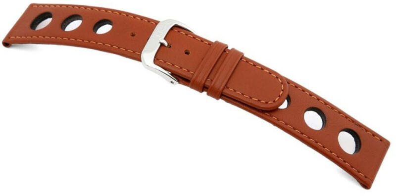 Kiváló minőségű bőr óraszíj a Rios márkától. A Racing óraszíj divatos, vintage megjelenésű, a lyukacsos design egyértelműen utal az autósport világának legendás arculatára. Színben igazodó varrással készült. A szíj 2 mm-t szűkül és 3mm vastag.