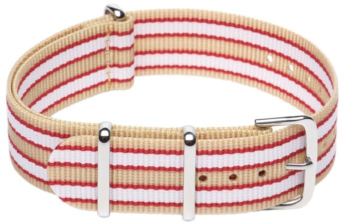 NATO óraszíj Ajánlott búvár (diver), katonai (military) és sportos stílusú karórához. Klasszikus viselet! Szín: bézs/piros/fehér Anyaga: nylon textil, fényes acél csatt Szélessége: 20 mm Hossz: 270 mm Vastagság: 1 mm Használja letölthetőméretezési segédletünket !