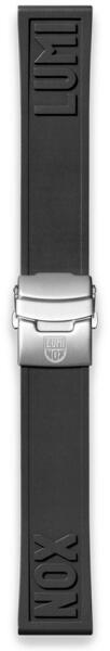 Testreszabható hosszúságú (a csuklómérethez igazítható/vágható), 24mm széles, acélcsatos gumiszíj, Lumi Nox felirattal. A szíj méretre igazítását az alábbi videó szemlélteti: