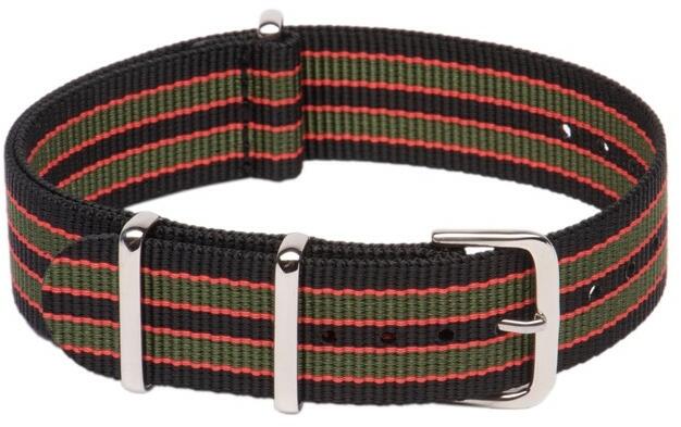 NATO óraszíj Ajánlott búvár (diver), katonai (military) és sportos stílusú karórához. Klasszikus viselet! Szín: fekete/piros/zöld Anyaga: nylon textil, fényes acél csatt Szélessége: 22 mm Hossza: 270 mm Vastagság: 1 mm