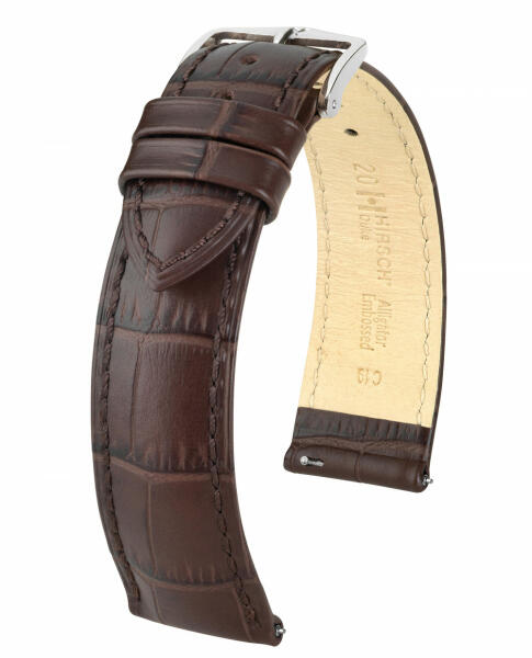 A legfinomabb olasz borjúbőr természetes hatású aligátor mintázattal és dombornyomott, kissé matt felülettel. Harmónikusan kialakított párnázás, finom tónusú visszavart varrás jellemzi ezt az örökzöld Hirch óraszíjat. Mindehez gyönyörű Hirsch Traditional Design csat és gyorszáras rugósfül is tartozik. Használja letölthetőméretezési segédletünket