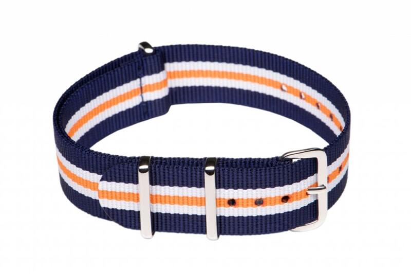 NATO óraszíj Ajánlott búvár (diver), katonai (military) és sportos stílusú karórához. Klasszikus viselet! Szín: kék/fehér/narancs Anyaga: nylon textil, fényes acél csatt Szélessége: 18 mm Hossz: 270 mm Vastagság: 1 mm Használja letölthetőméretezési segédletünket !