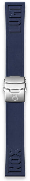 Testreszabható hosszúságú (a csuklómérethez igazítható/vágható), 24mm széles, acélcsatos gumiszíj, Lumi Nox felirattal. A szíj méretre igazítását az alábbi videó szemlélteti: