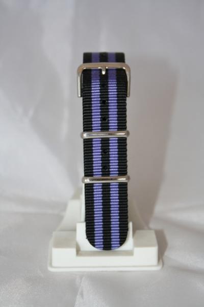 NATO óraszíj Ajánlott búvár (diver), katonai (military) és sportos stílusú karórához. Klasszikus viselet! Szín: fekete/lila Anyaga: nylon textil, fényes acél csatt Szélessége: 24 mm Hossz: 270 mm Vastagság: 1 mm Használja letölthetőméretezési segédletünket !