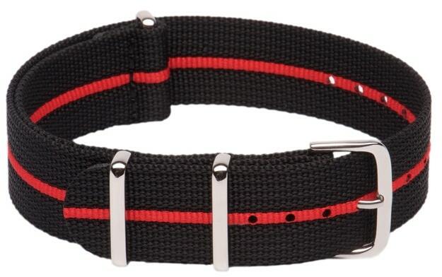 NATO óraszíj Ajánlott búvár (diver), katonai (military) és sportos stílusú karórához. Klasszikus viselet! Szín: fekete/piros Anyaga: nylon textil, fényes acél csatt Szélessége: 22 mm Hossz: 270 mm Vastagság: 1 mm Használja letölthetőméretezési segédletünket !