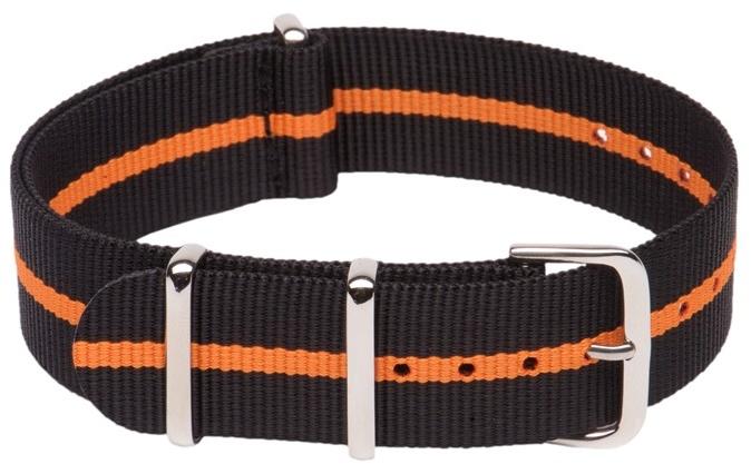 NATO óraszíj - James Bond stílusú Ajánlott búvár (diver), katonai (military) és sportos stílusú karórához. Klasszikus viselet! Szín: fekete/narancs Anyaga: nylon textil, fényes acél csatt Szélessége: 22 mm Hossz: 270 mm Vastagság: 1 mm Használja letölthetőméretezési segédletünket !