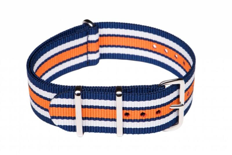 NATO óraszíj Ajánlott búvár (diver), katonai (military) és sportos stílusú karórához. Klasszikus viselet! Szín: kék/fehér/kék/narancs Anyaga: nylon textil, fényes acél csatt Szélessége: 22 mm Hossza: 270 mm Vastagság: 1 mm Használja letölthetőméretezési segédletünket !