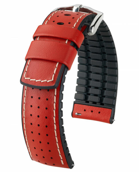 A Hirsch Tiger az ideális társ a sporthoz és a mindennapokhoz. Karcálló, kopásálló, kiváló minőségű perforált borjúbőr kivételesen finom kidolgozással és Hirsch Prémium kaucsuk felhasználása a belső felületen. Karakteres rozsdamentes acél csattal és gyorszáras rugósfüllel, nagy színválasztékban. Használja letölthetőméretezési segédletünket