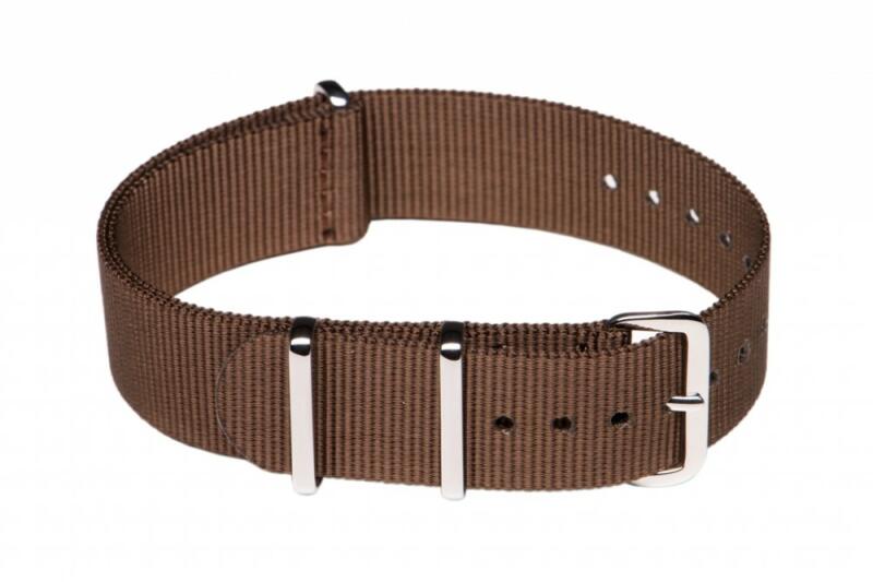 NATO óraszíj Ajánlott búvár (diver), katonai (military) és sportos stílusú karórához. Klasszikus viselet! Szín: sötétbarna Anyaga: nylon textil, fényes acél csatt Szélessége: 22 mm Hossza: 270 mm Vastagság: 1 mm