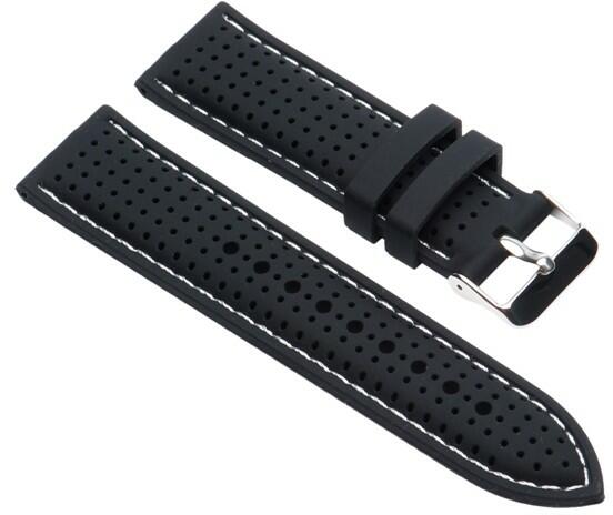 Szilikon óraszíj Szín: fekete, fehér varrással Anyaga: szilikon, fényes acél csat Szélessége: 22 mm Hossz: 125/80 mm (plusz csat) Vastagság: 4 mm Használja letölthetőméretezési segédletünket !