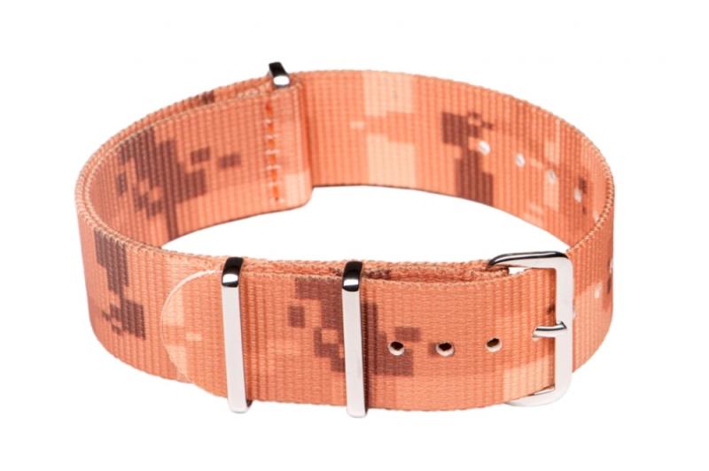 NATO óraszíj Ajánlott búvár (diver), katonai (military) és sportos stílusú karórához. Klasszikus viselet! Szín: világos barna digitális terepmintás Anyaga: nylon textil, fényes acél csatt Szélessége: 22 mm Hossz: 270 mm Vastagság: 1 mm Használja letölthetőméretezési segédletünket !