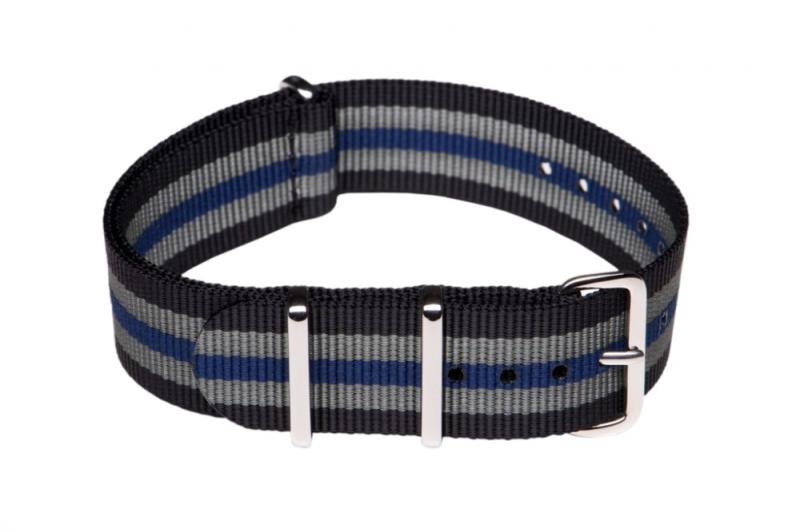 NATO óraszíj Ajánlott búvár (diver), katonai (military) és sportos stílusú karórához. Klasszikus viselet! Szín: fekete/szürke/kék Anyaga: nylon textil, fényes acél csatt Szélessége: 20 mm Hossz: 270 mm Vastagság: 1 mm Használja letölthetőméretezési segédletünket !