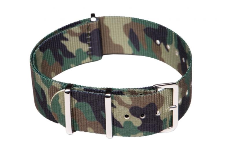 NATO óraszíj Ajánlott búvár (diver), katonai (military) és sportos stílusú karórához. Klasszikus viselet! Szín: sötétzöld terepmintás Anyaga: nylon textil, fényes acél csatt Szélessége: 24 mm Hossz: 270 mm Vastagság: 1 mm Használja letölthetőméretezési segédletünket !