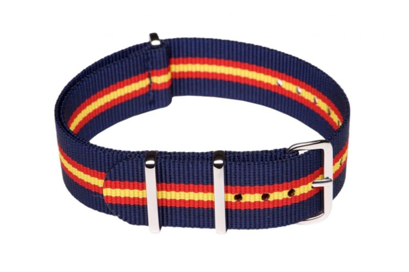 NATO óraszíj Ajánlott búvár (diver), katonai (military) és sportos stílusú karórához. Klasszikus viselet! Szín: kék/piros/sárga Anyaga: nylon textil, fényes acél csatt Szélessége: 20 mm Hossz: 270 mm Vastagság: 1 mm Használja letölthetőméretezési segédletünket !