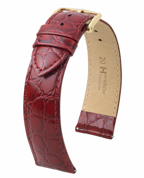 Lenyűgöző a diszkrét dizájnjával és különleges, elegáns fényével. Tartós borjúbőrből készült, karakteres krokodibőr mintázatú dombornyomással. Gyönyörű Hirsch Traditional Deisgn csattal és gyorszáras rugósfüllel ellátva. Használja letölthetőméretezési segédletünket
