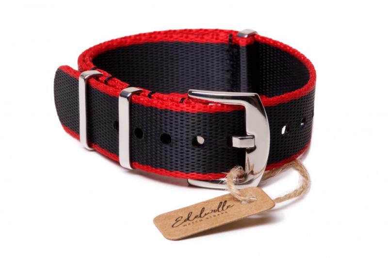 Ez az óraszíj ívelt kialakítású, puha és kényelmes nylon szövet külsővel és bőr belsővel rendelkezik. A Campagnolo olasz óraszíj gyár készíti. Vastagsága 4,5 mm. Az óraszíj 2 mm-t szűkül.