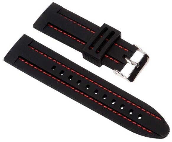 Szilikon óraszíj Szín: fekete, piros varrással Anyaga: szilikon, fényes acél csat Szélessége: 24 mm Hossz: 130/75 mm (plusz csat) Vastagság: 4 mm Használja letölthetőméretezési segédletünket !