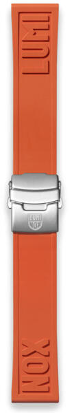Testreszabható hosszúságú (a csuklómérethez igazítható/vágható), 24mm széles, acélcsatos gumiszíj, Lumi Nox felirattal. A szíj méretre igazítását az alábbi videó szemlélteti: